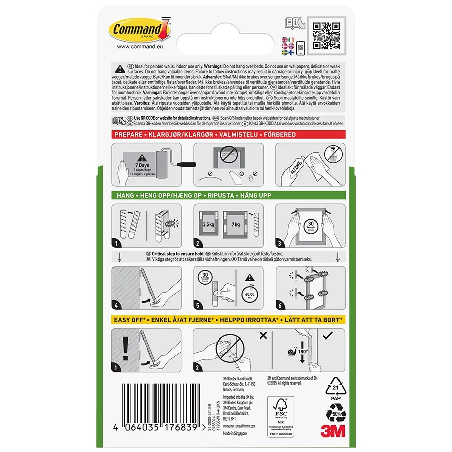 Strips til genplacering af Command kroge, ledningsholdere etc. Kan også bruges løse til ophængning af plakater mm. De 4 strips Kan bære en ramme, der vejer op til 7,0 kg. Egnet til de fleste glatte overflader, herunder malede vægge, fliser, metal og træ.